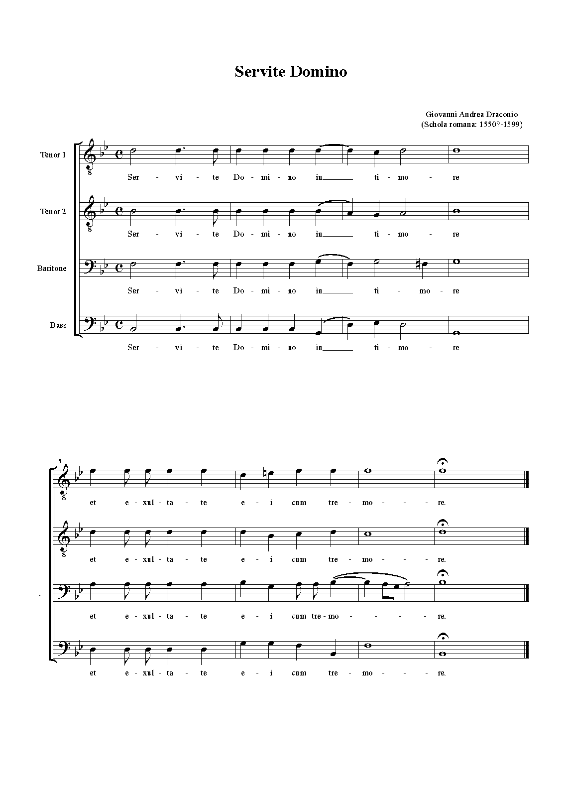 Source (or collection) is not listed, nor is this work in RISM. However, this is tagged as a motet, on the basis that according to Wikipedia, much of his sacred music was lost, but one volume of motets survives, which RISM lists as being for 5 voices. Tagging is subject to correction should this collection not contain Servite Domino.