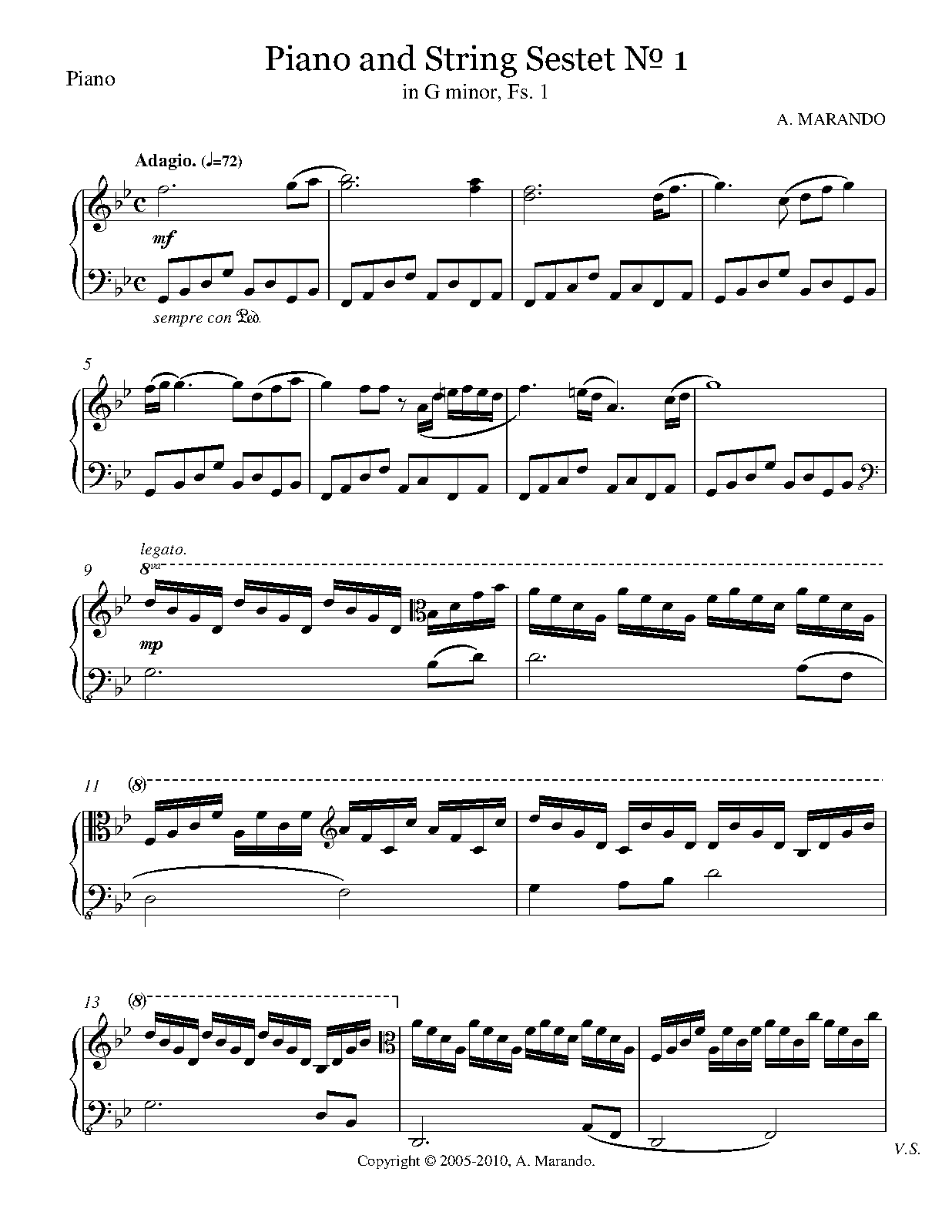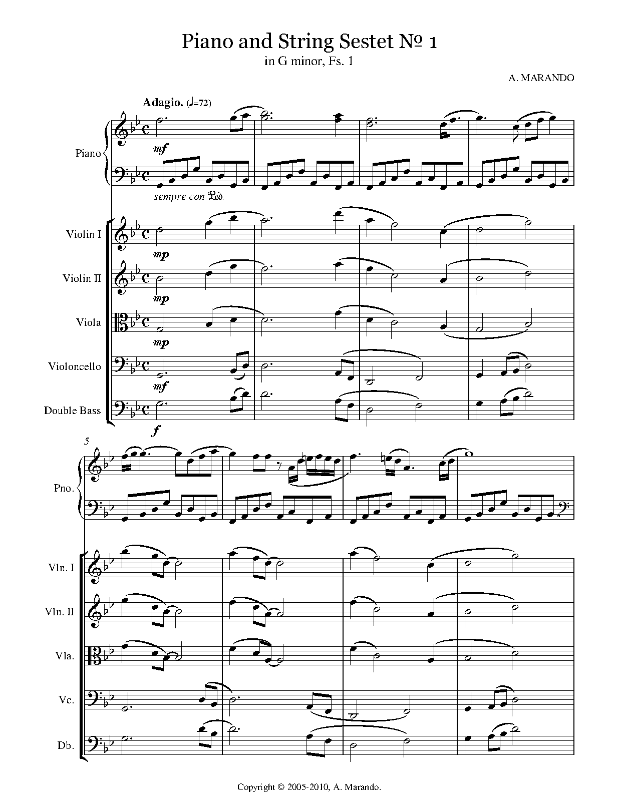 2 violins, 1 viola, 1 cello, 1 contrabass, 1 piano