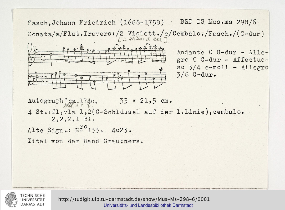 | Alternative. Title | Sonata a Flut. Travers., 2 Violett. e Cembalo. |