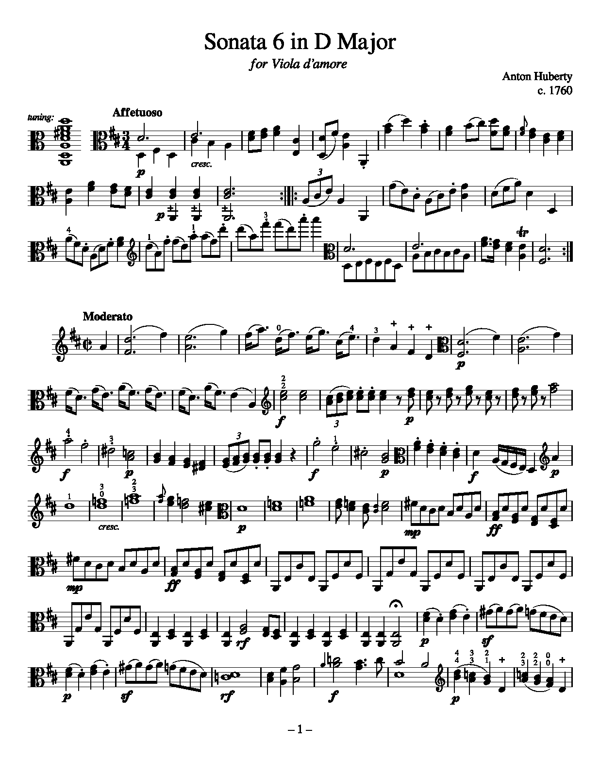 From a collection of pieces published by Anton Huberty in Paris, 1760. The only known copy is in the Sibley Music Library, Eastman School of Music, Rochester, New York. The collection comprises arrangements of music for viola d'amore made by Huberty as well as his own pieces. This is the sixth of nine solo sonatas for viola d’amore written by Huberty. The original is notated in scordatura, but here it is presented in standard notation (at pitch). The viola d'amore is tuned in the customary D major tuning. I have preserved Huberty's intended fingerings which were indicated by the scordatura. Generally, the implied position indicated by a fingering is held until the next fingering mark or, in most cases, a change of clef. "Scaniello" is an archaic term for "sul ponticello". Dynamics and other markings not in the original are in parenthesis. —GS