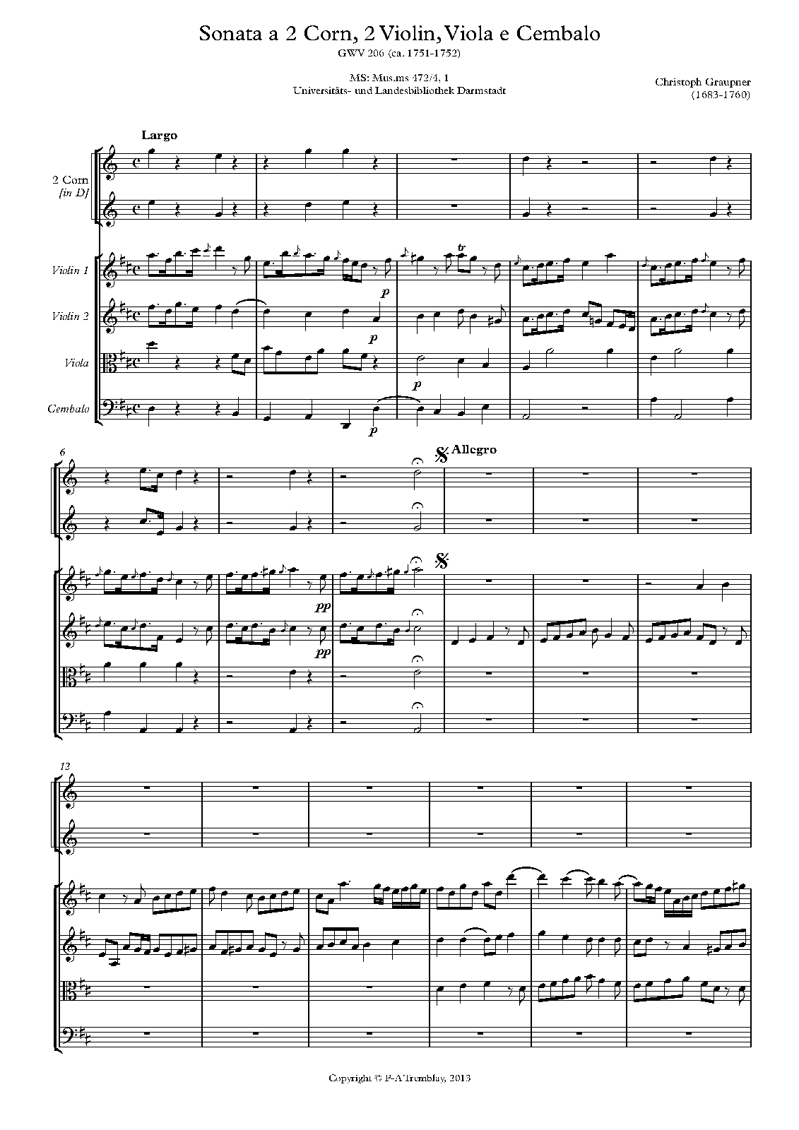 | Instrumentation | 2 horns, 2 violins, viola, continuo (harpsichord) |