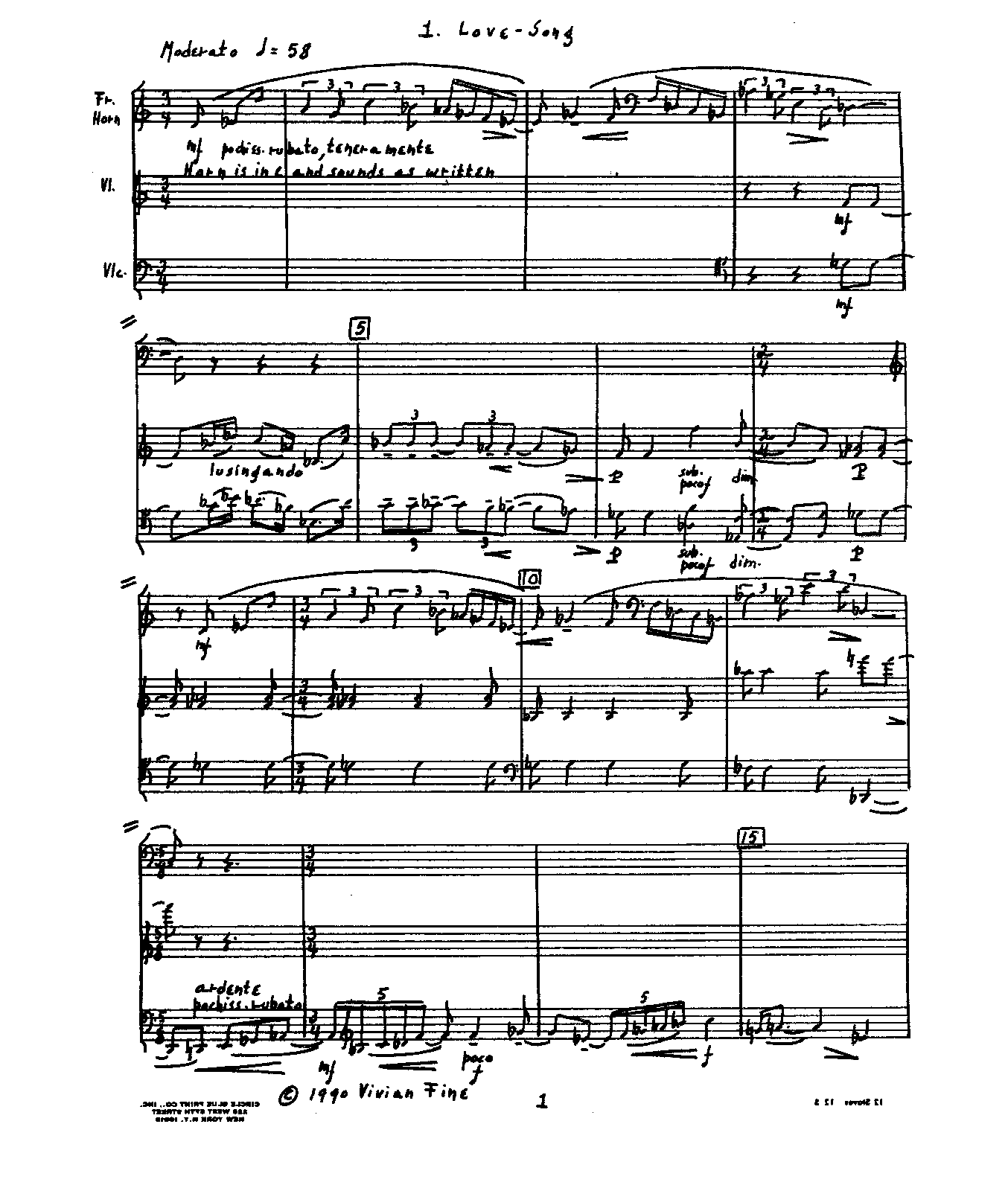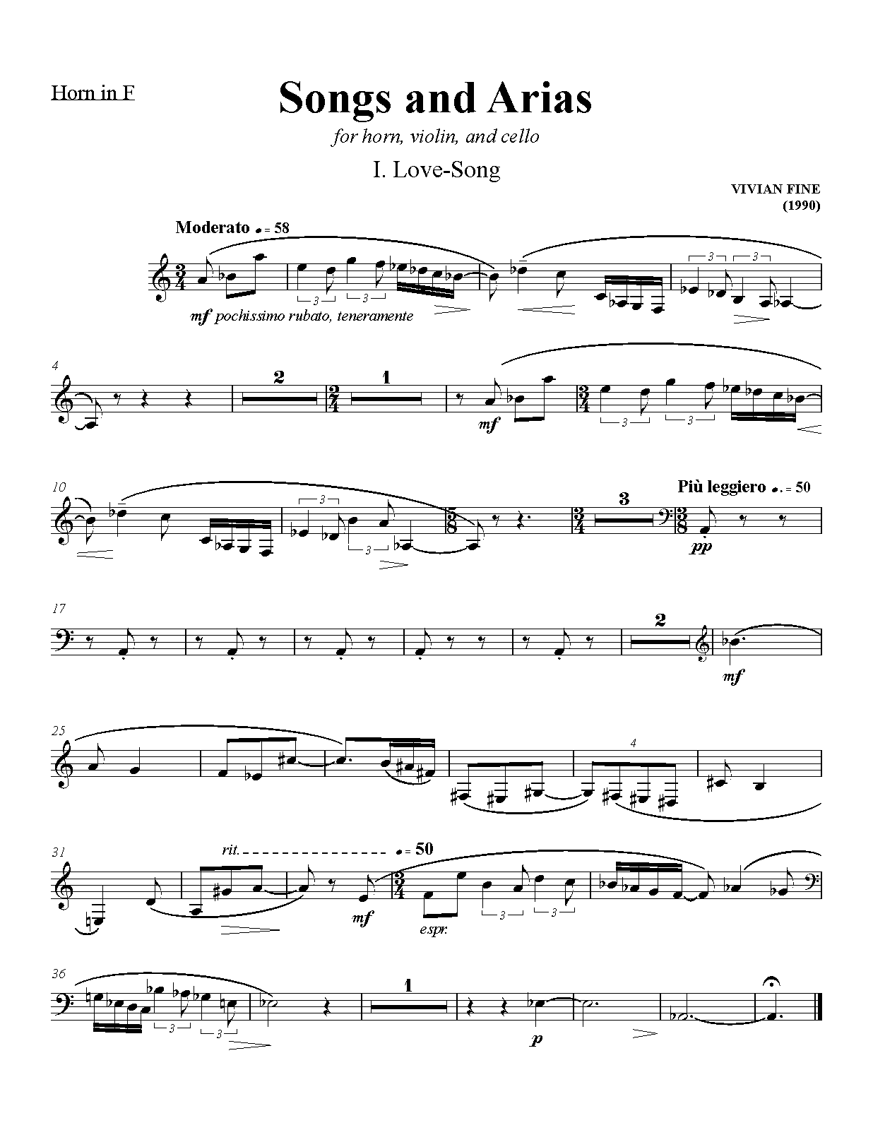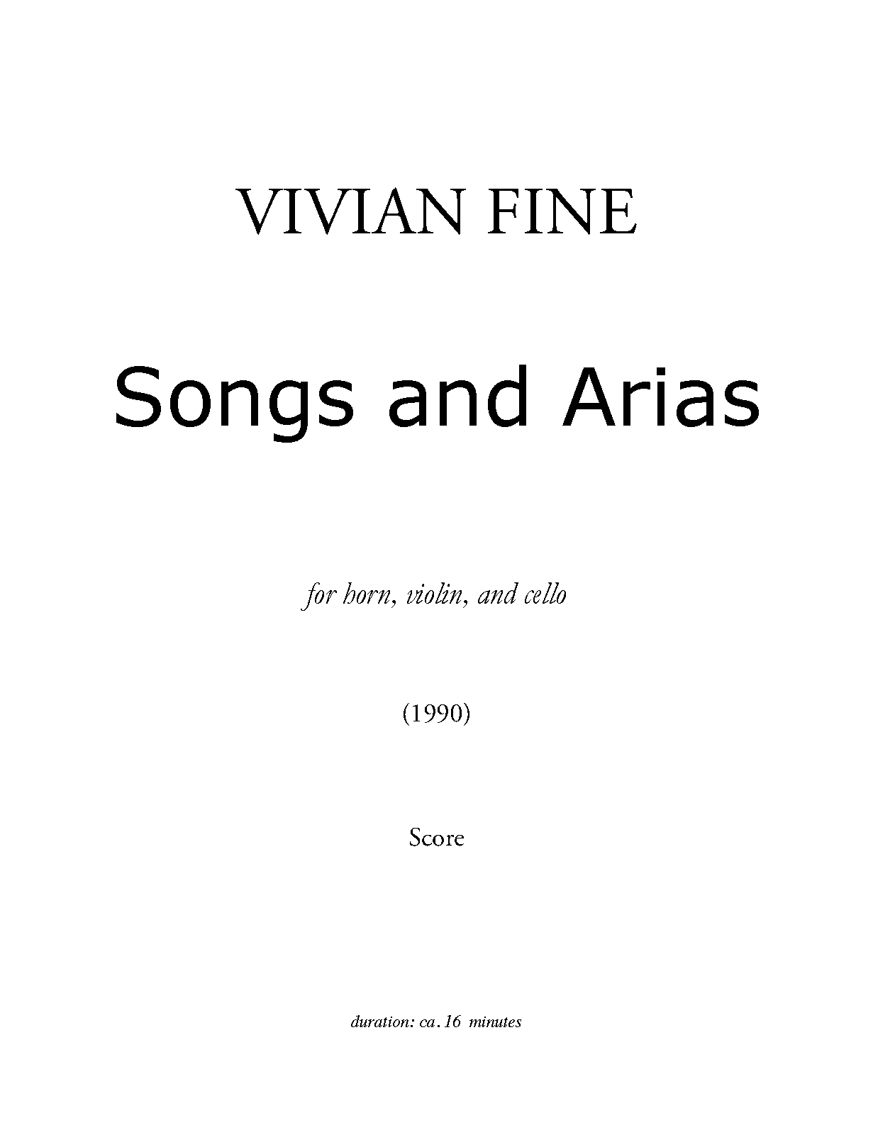 Songs and Arias, for French horn, violin and cello, is my most recent [instrumental] work based on vocal forms. Lieder for Viola and Piano was written in 1979, Toccatas and Arias for Harpsichord in 1986, Toccatas and Arias for Piano in 1987, Madrigali Spirituali, for trumpet and string quartet, in 1989. There is a wide range of moods in Songs and Arias: the elegiac mood of the Arioso, the intensity of Canto Hondo, the parodies Rupert’s Aria (from the non-existent opera “Unfulfilled”) and the Aria from the equally non-existent Cantata.
