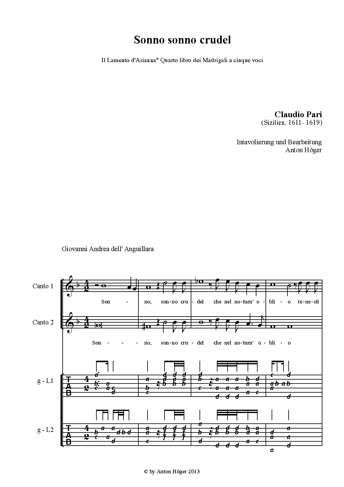 Intavolation in staff notation and french Lute-tabulatur for 2 Sopranos and 2 Lutes in g. If performed I would look forward about a small reference to my efforts.