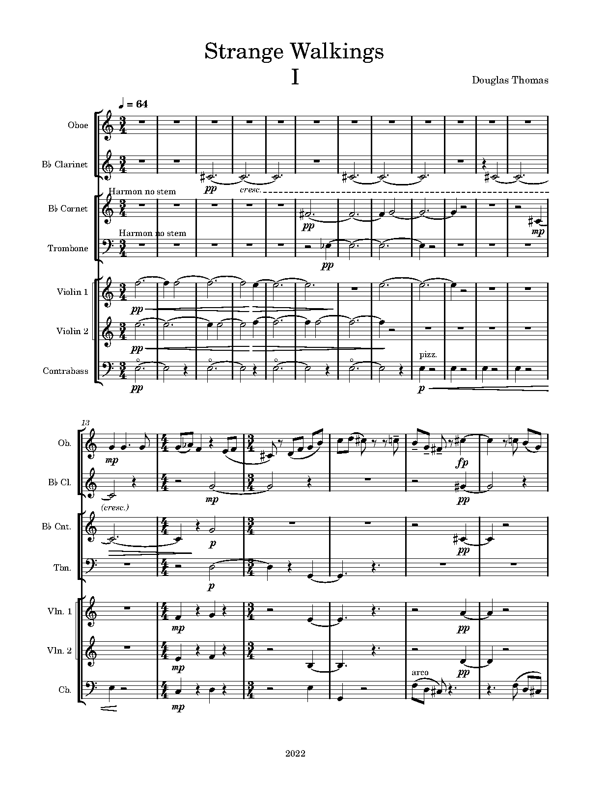 oboe, clarinet, cornet (or trumpet), trombone, 2 violins, double bass
