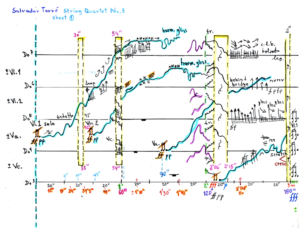 This is the realization in traditional writing of the 3rd. movement "Direct-Dimensional", first 3 minutes, first 3 pages of the original (graphic) score.