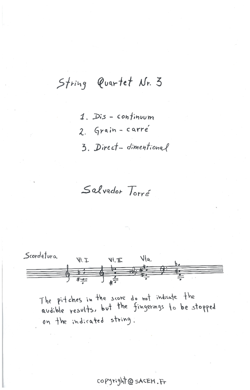 In the String Quartet it has been practiced throughout the history of music the aspect of Laboratory of Forms, laboratory of Writings, of Methods, of Styles, of Compositional Substrates etc. using old methods arises from the canonical imitative forms counterpoint or harmony, all combined with the today languages, the infinity of music we hear today from which, for me the Rock music is very important, as well as electroacoustic practices are evident in this quartet, mixtures and super-positions of elements in a space time either compacted or expanded, micro-imitations are now a days called “delays” or “echoes”. Different distortions caused by the ways of attacking, rub, pull hitting different parts of the instrument etc. All this adding an important element today: Improvisation, the interpreter then is enrolled in a state of freedom, but because we are speaking on classical music, this classical style provides the concept of structure, it brings a certain rigorous form. This generates an open-closed form, hence the title of this quartet "Dis-continuum" in a certain way the “continuous” is due to the improvisation and the “discontinuous” is associated to the form or structure proposed in the score.