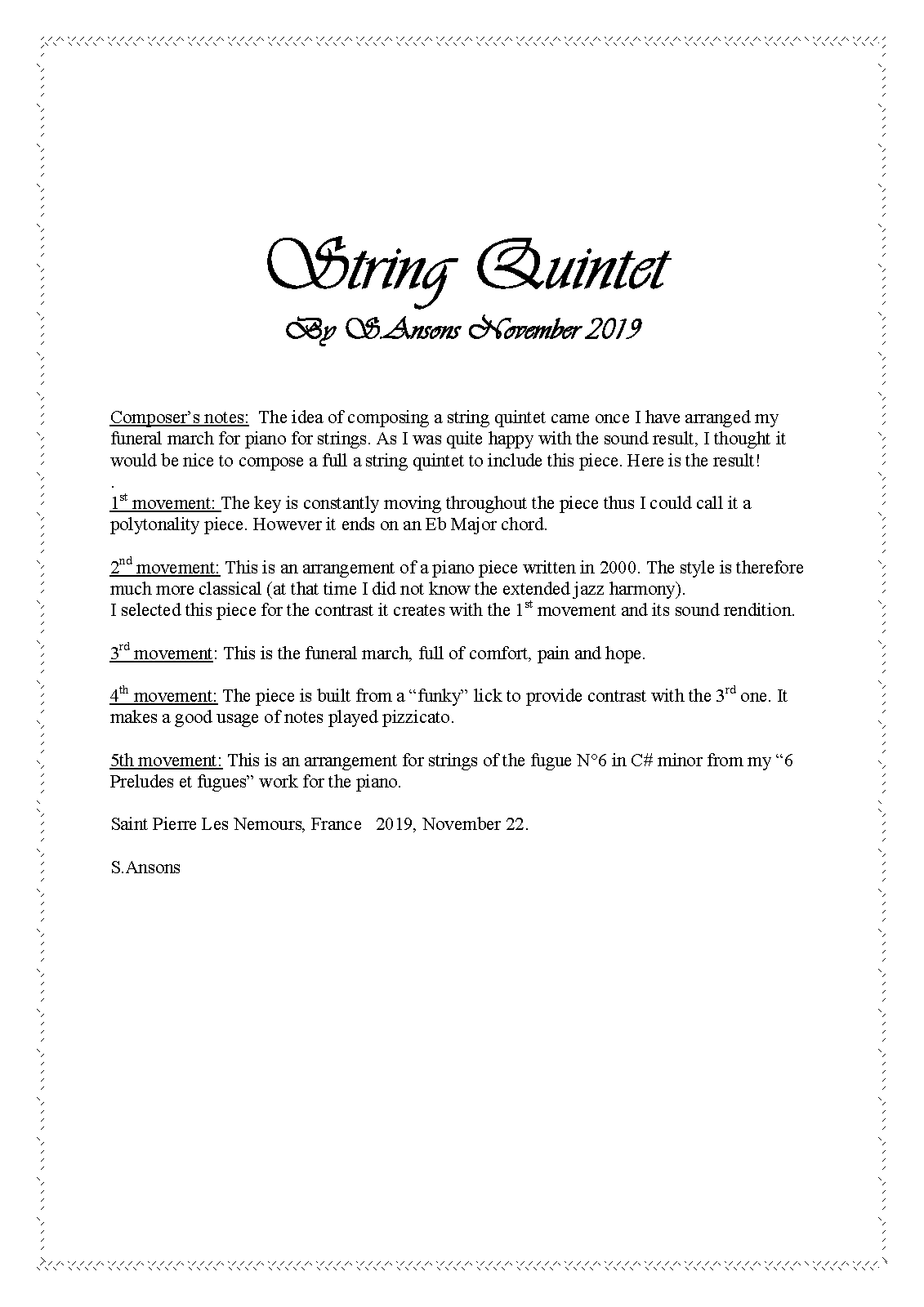 Composer’s notes: The idea of composing a string quintet came once I have arranged my piano funeral march for strings. As I was quite happy with the sound result, I thought it would be nice to compose a full a string quintet to include this piece. Here is the result! . 1st movement: The key is constantly moving throughout the piece thus I could call it a polytonality piece. However it ends on an Eb Major chord.