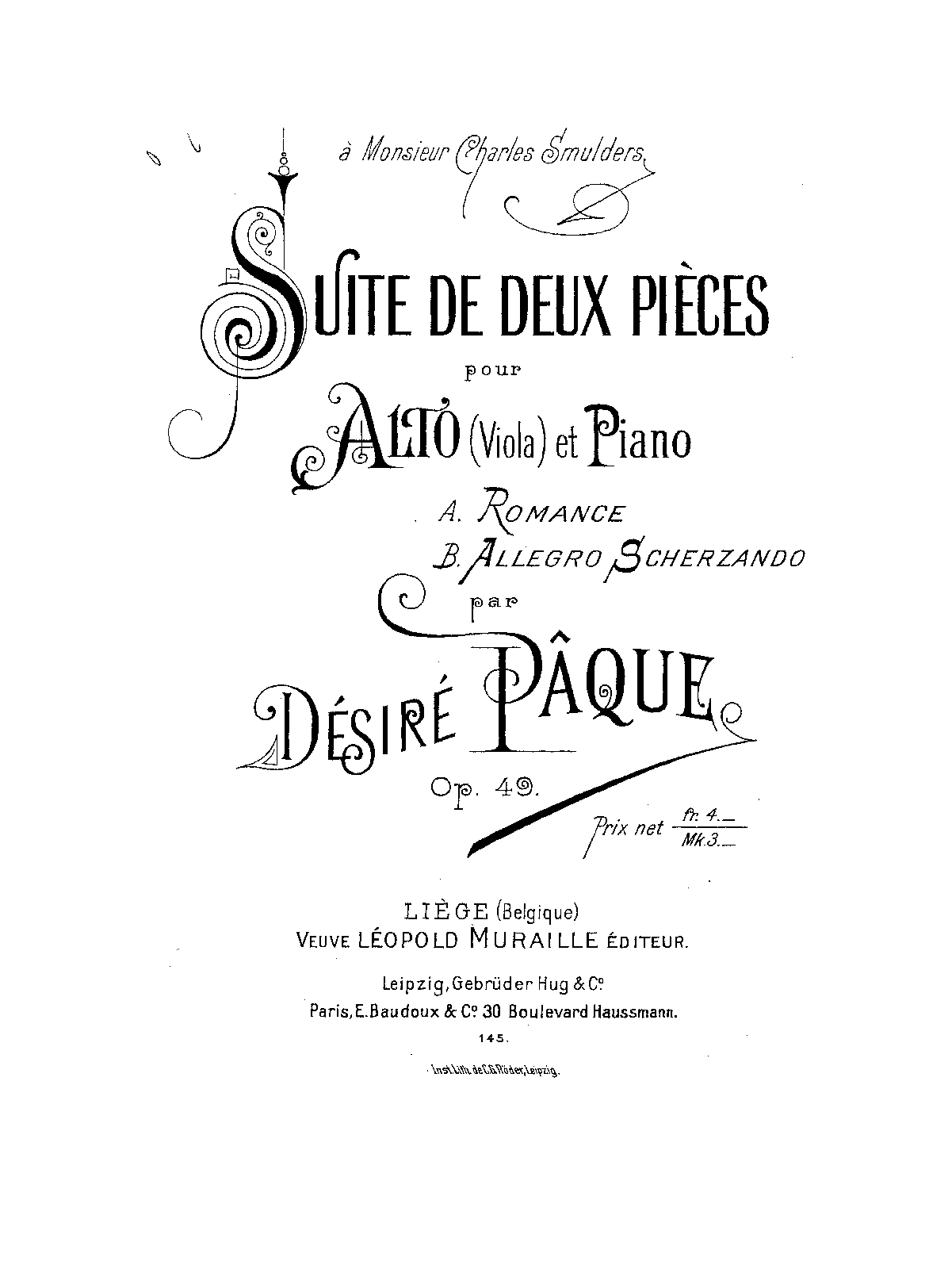 odd, since at least according to U Colorado at Boulder Pâque's opus 49 is an impromptu for piano from 1912, I wonder if something is up. Strangeness... but this score has complete identification... maybe one or the other score suffers from an opus no. typo (as happens). If Pâque's opus numbers are fairly consistent in association with time (want of better expression), the late opus 40s are in the 1890s and the late opus 60s (sonatas 1 and 2 published, like the Impromptu in question, by Simrock, in 1912) making me think "typo" and that yes, this is opus 49 and not, pace French Wikipedia, the Simrock-published Impromptu pub.1912. (Wikipedia has: Suite de deux pièces (Romance et Allegro Scherzando) pour alto et piano, op. 24 (1892); publié comme "op. 49". However, again, other works in the vicinity of opus 49 were also published in the 1890s, while other works published in 1912 were in the late opus 60s.)