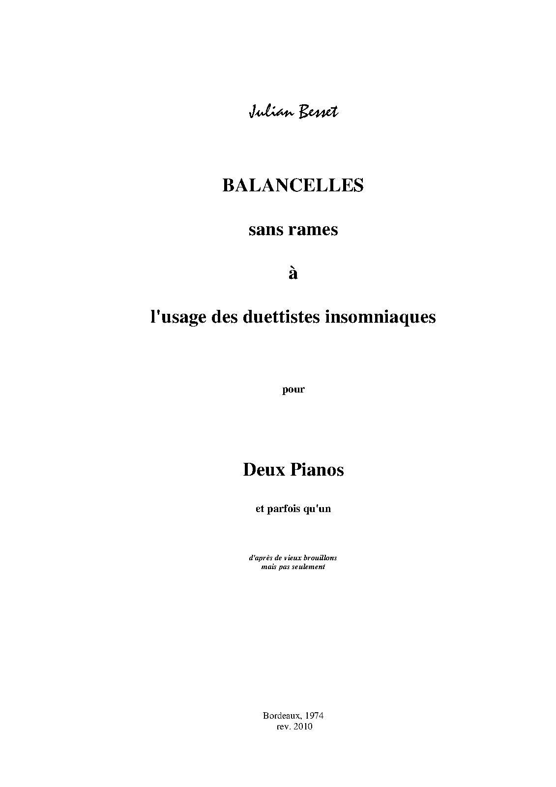 | Extra Information | The first version was an initial approach to a 2 Piano composition. Since its inception, the work has gone through several tentative but unsatisfactory stages. The latest can be considered as more or less stable. Accordingly, each movement is presented separately, instead of like the original one volume edition. |