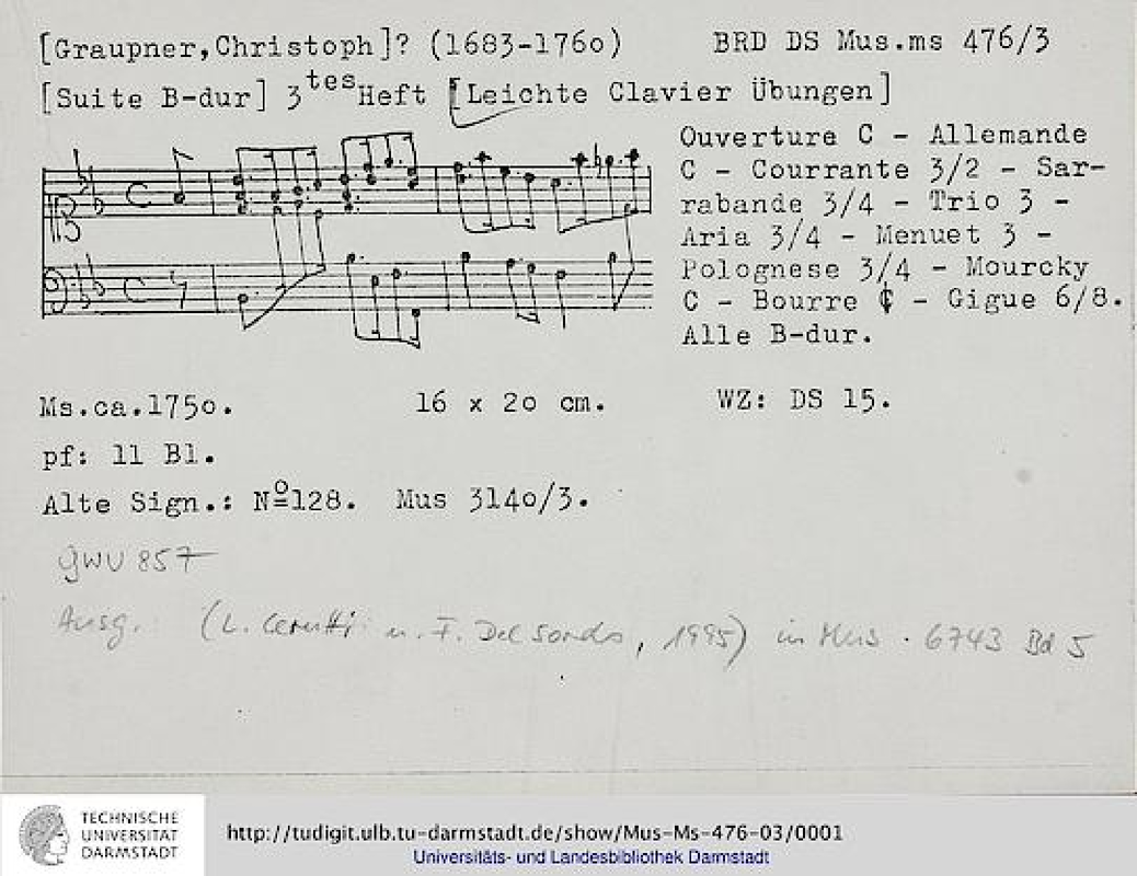 | Movements/SectionsMov'ts/Sec's | 11 movements: Ouvertura - Allemande - Courrante - Sarabande - Trio - Aria - Menuet - Polognese - Mourcky - Bourre - Gigue |