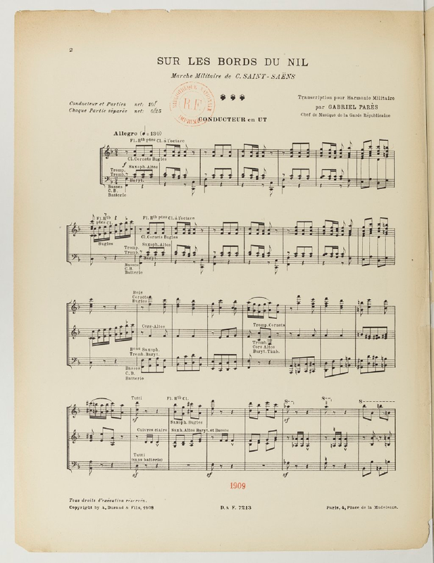 | Extra Information | Although Saint-Saëns' own band version (including short score) has not been found, Teller-Ratner's classification as a military band work seems to be based on a description in Saint-Saëns' letter, “Je viens d'écrire une marche à l'intention de la musique du Khédive” [I have just written a march for the Khedive's band]. (Sabina Teller-Ratner, Camille Saint-Saëns, 1835-1921: The instrumental works, pp. 247-48.) |