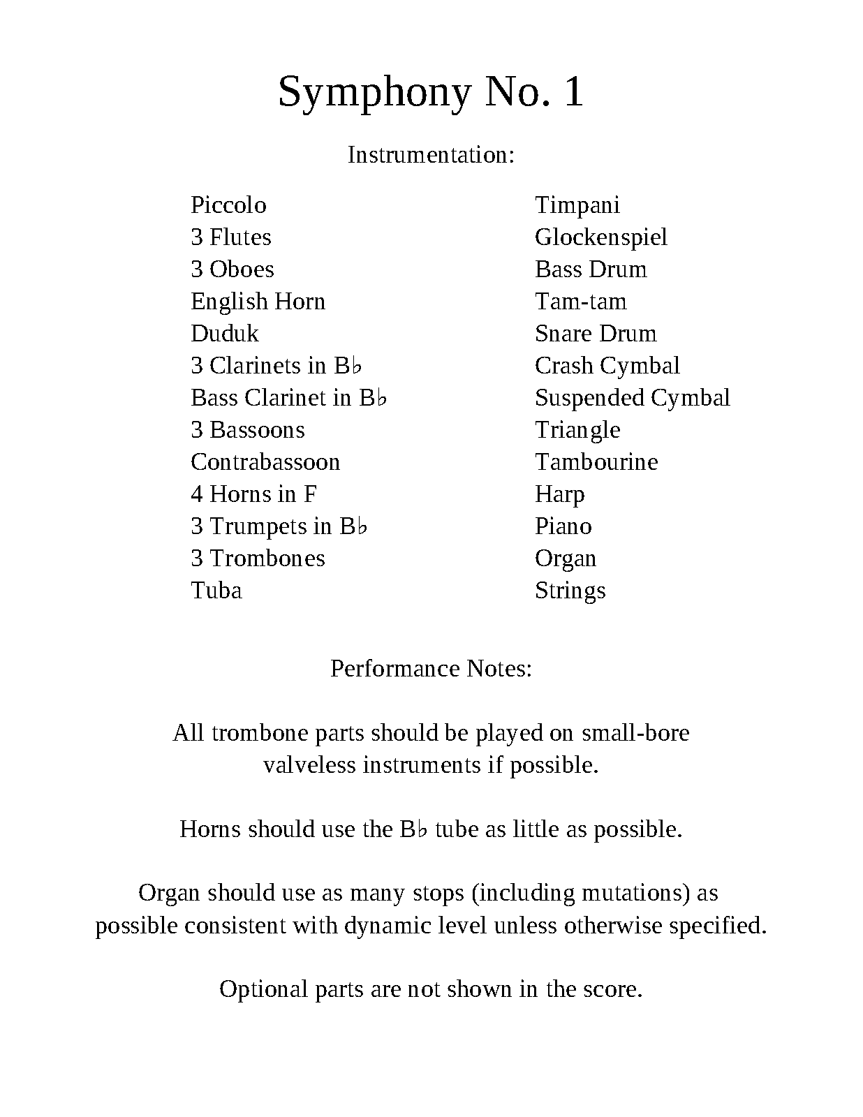 ⇒ 40 more: Flute 1 • Flute 2 • Flute 3 • Oboe 1 • Oboe 2 • Oboe 3 • English Horn • Duduk • Duduk (A transposed) • Duduk (E♭ transposed) • Clarinet 1 (B♭) • Clarinet 2 (B♭) • Clarinet 3 (B♭) • Bass Clarinet (B♭) • Bassoon 1 • Bassoon 2 • Bassoon 3 • Contrabassoon • Horn 1 (F) • Horn 2 (F) • Horn 3 (F) • Horn 4 (F) • Trumpet 1 (B♭) • Trumpet 2 (B♭) • Trumpet 3 (B♭) • Trombone 1 • Trombone 2 • Trombone 3 • Tuba • Timpani • Glockenspiel • Bass Drum, Tam-Tam, Snare Drum, Cymbals, Triangle, Tambourine • Piano • Organ • Harp • Violins I • Violins II • Violas • Cellos • Basses