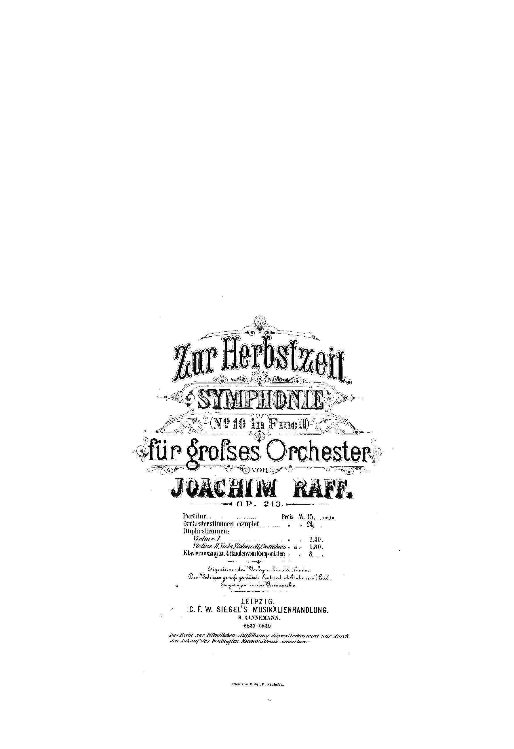 | Extra Information | Raff's last symphony (symphony no.11 was apparently composed a few years earlier but published posthumously.). There is also a stand-alone "Elegie" (WoO.48) for orchestra that was intended to be the third movement of this symphony - and may have been part of its 1879 version? - before it was replaced by the current movement. |
