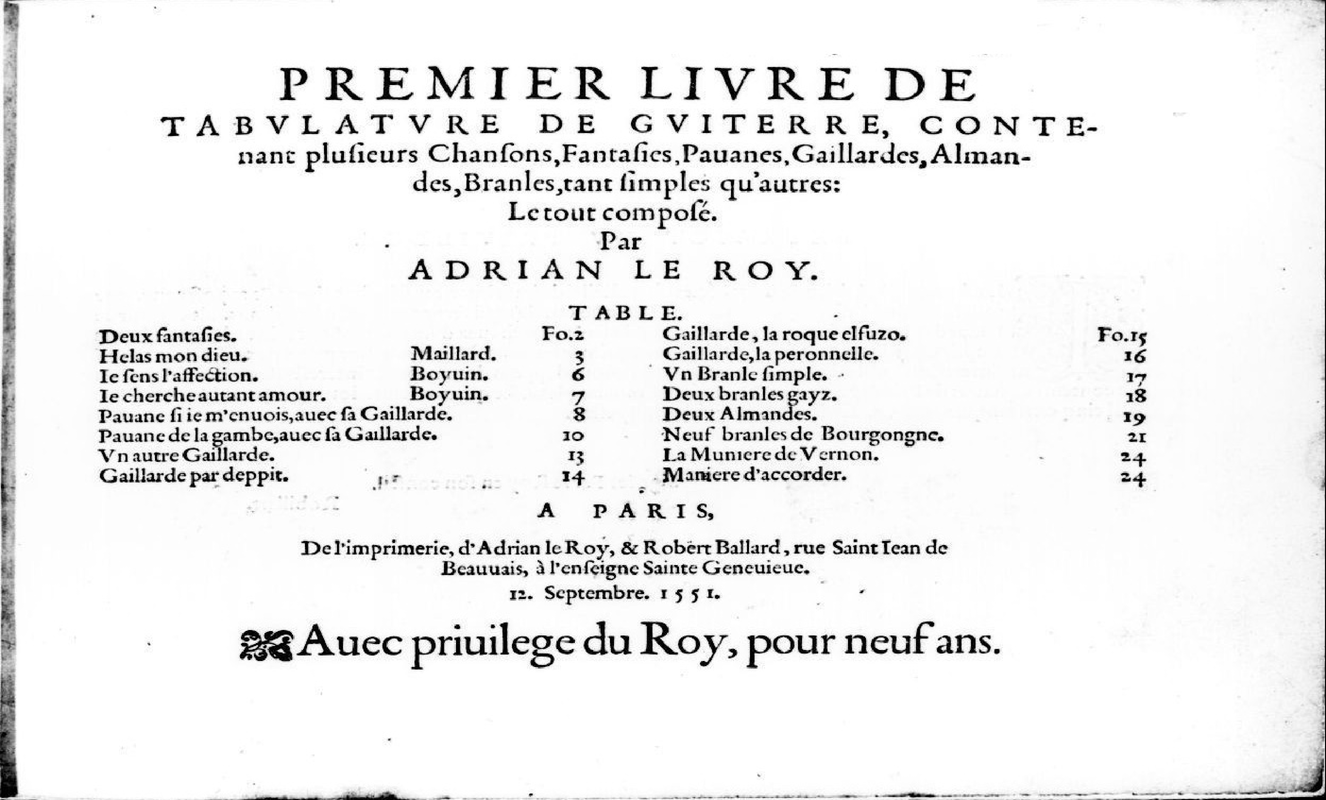 Premier livre de tabulature de guiterre, contenant plusieurs Chansons, Fantasies, Pauanes, Gaillardes, Almandes, Bransles, tant simples qu'autres: le tout compose par Adrian Le Roy. A Paris, De l'imprimerie, d'Adrian le Roy, & Robert Ballard, rue Saint Jean de Beauvais, a l'enseigne Sainte Genevieve. 12. Septembre. 1551.