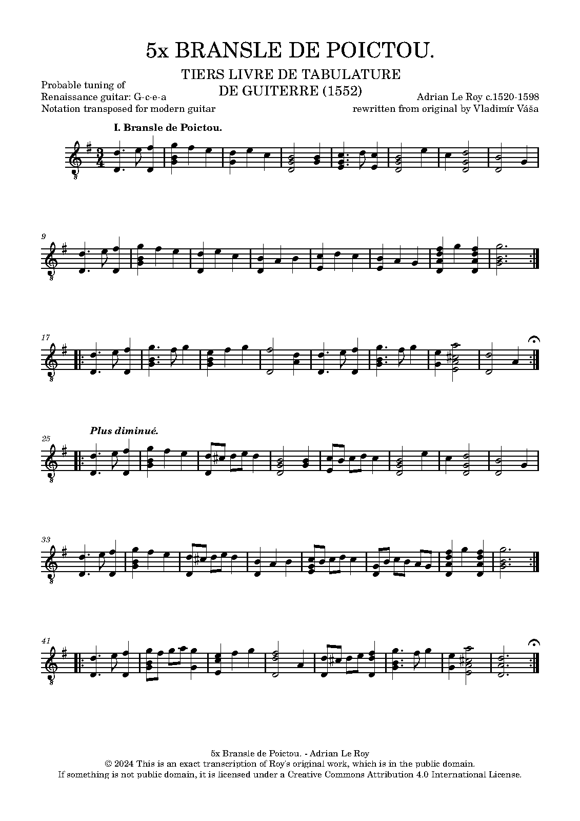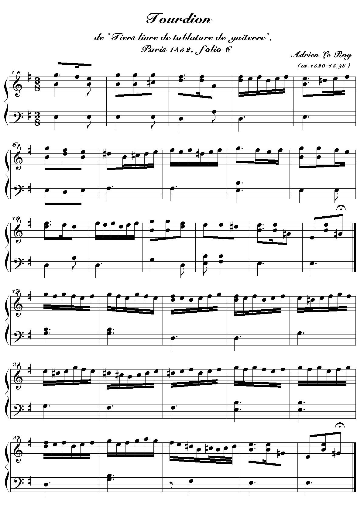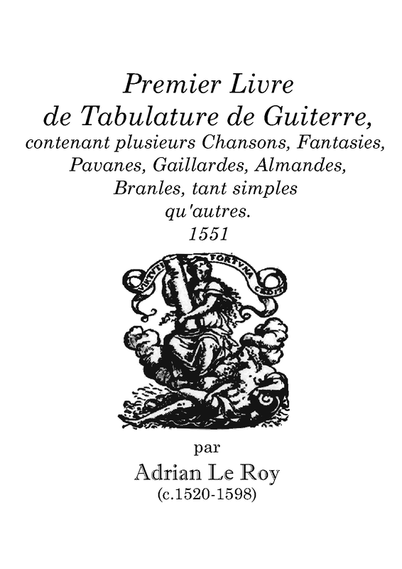 Tiers Livre de Tabvlatvre de Gviterre, contenant plusieurs Preludes, Chansons, Basse-dances, Tourdions, Pauanes, Gaillardes, Almandes, Bransles, tant doubles que simples. Le tout compose par Adrian le Roy