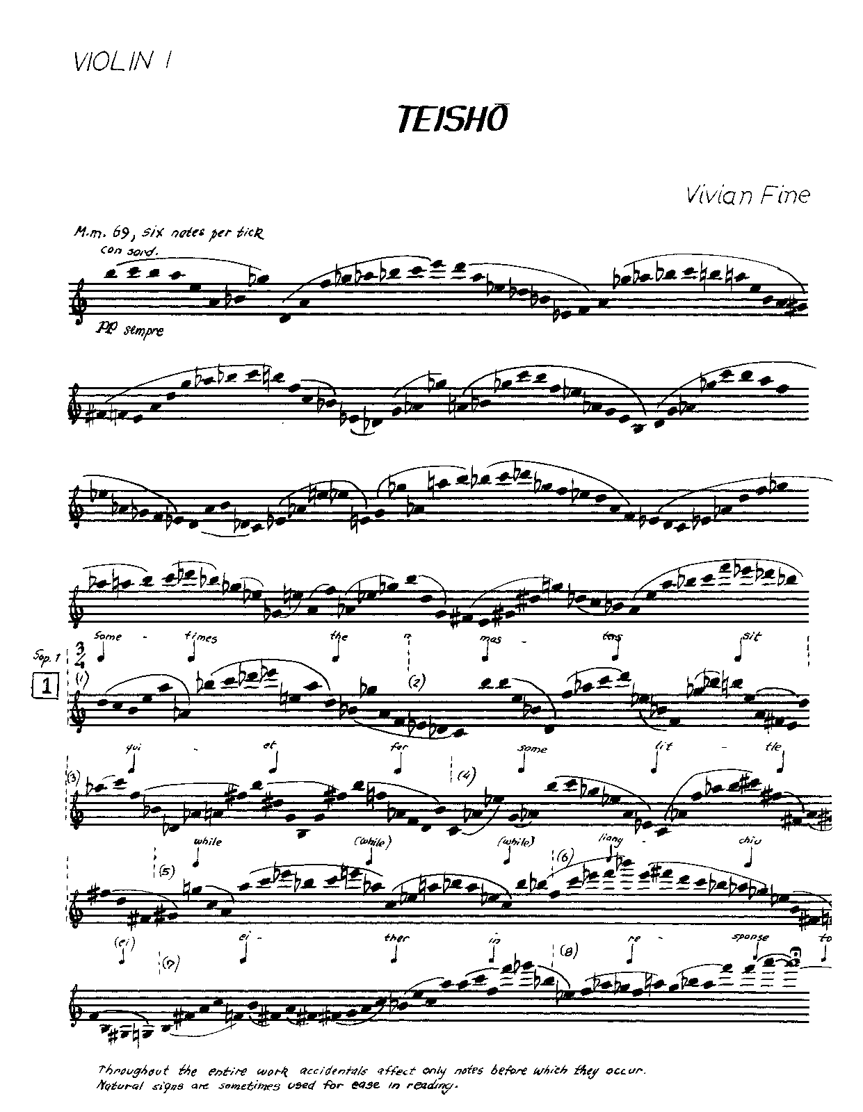 …Teisho’s layerings, texture manipulation, and advanced string writing resemble ideas Fine experimented with in Missa Brevis. Also, both pieces reflect her spiritual inquiries at the time. Zen training was becoming much more available in the United States during the mid-1970s, and Fine, a voracious reader, explored some of D.T. Suzuki’s writings and selected several Zen stories to set to music. As indicated on the score, “Teisho are the sermons or talks delivered by the Zen masters to the disciples.” Often a teisho involves a puzzle that is difficult for the listener to comprehend, and Fine’s Teisho is no exception. For her it was an opportunity to be “interested in two kinds of time, seamless and measured."