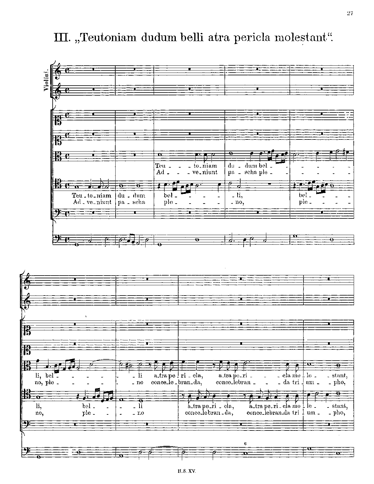Zur Huldigung der schlesischen Stände. Probably for the oath of loyalty to Johann Georg. Ceremonial text: "Omnibus o bona pax gaudia mille ferat. Laetentur cives patulo gens omnis in orbe, In Patria dulci prosperitate nova. Tota Slesis resonet, resonet jam tota Budorgis: Omnibus o bona pax gaudia" (Also SWV338:2 with alternative ecclesiastic text: Adveniunt pascha pleno concelebranda triumpho )