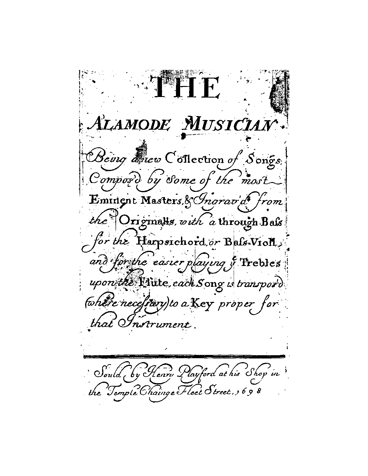 Being a new Collection of Songs Compos'd by some of the most Eminent Masters & Ingrav'd from the Originalls, with a through Bass for the Harpsichord or Bass-Violl, and for the easier playing the Trebles upon the Flute, each Song is transpos'd (where necessary) to a Key proper for that Instrument.
