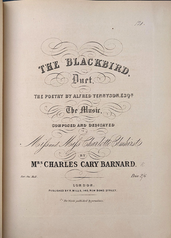 Composer is credited under her real married name, "Mrs. Charles Cary Barnard." Dedicatees are her cousins, Elizabeth Jane ("Janie") and Charlotte Elmhirst.