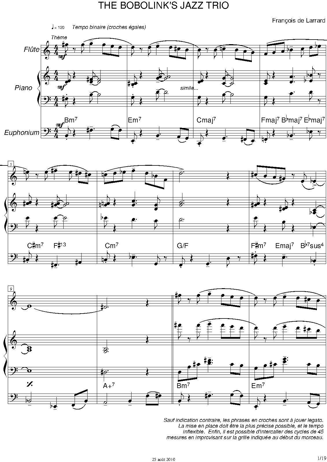 | Extra Information | Although referring to jazz in terms of harmony and rhythm, the piece is totally written. However, more variations can be added through improvising on the theme chord sequence. |