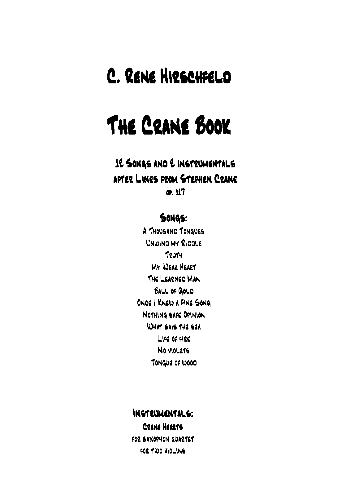 This are 12 songs written as a real book. one instrumental vor 2 violins and one instrumental for saxophone quartet.
