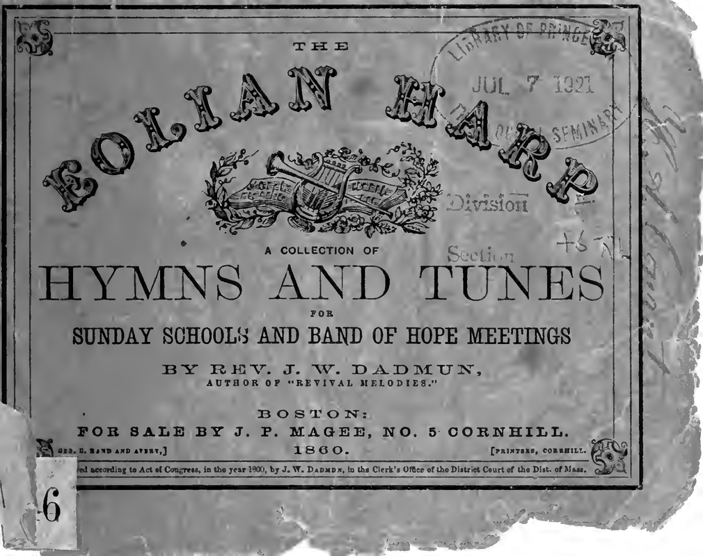 | Alternative. Title | The Eolian Harp. A Collection of Hymns and Tunes for Sunday Schools and Band of Hope Meetings by Rev. J. W. Dadmun, author of 'Revival Melodies' |