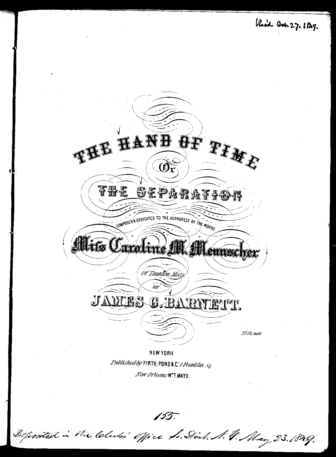 Composer is listed as James G. 'Barnett' on the title page, and 'Bamett' in the sheet music. It seems likely that the former is correct.