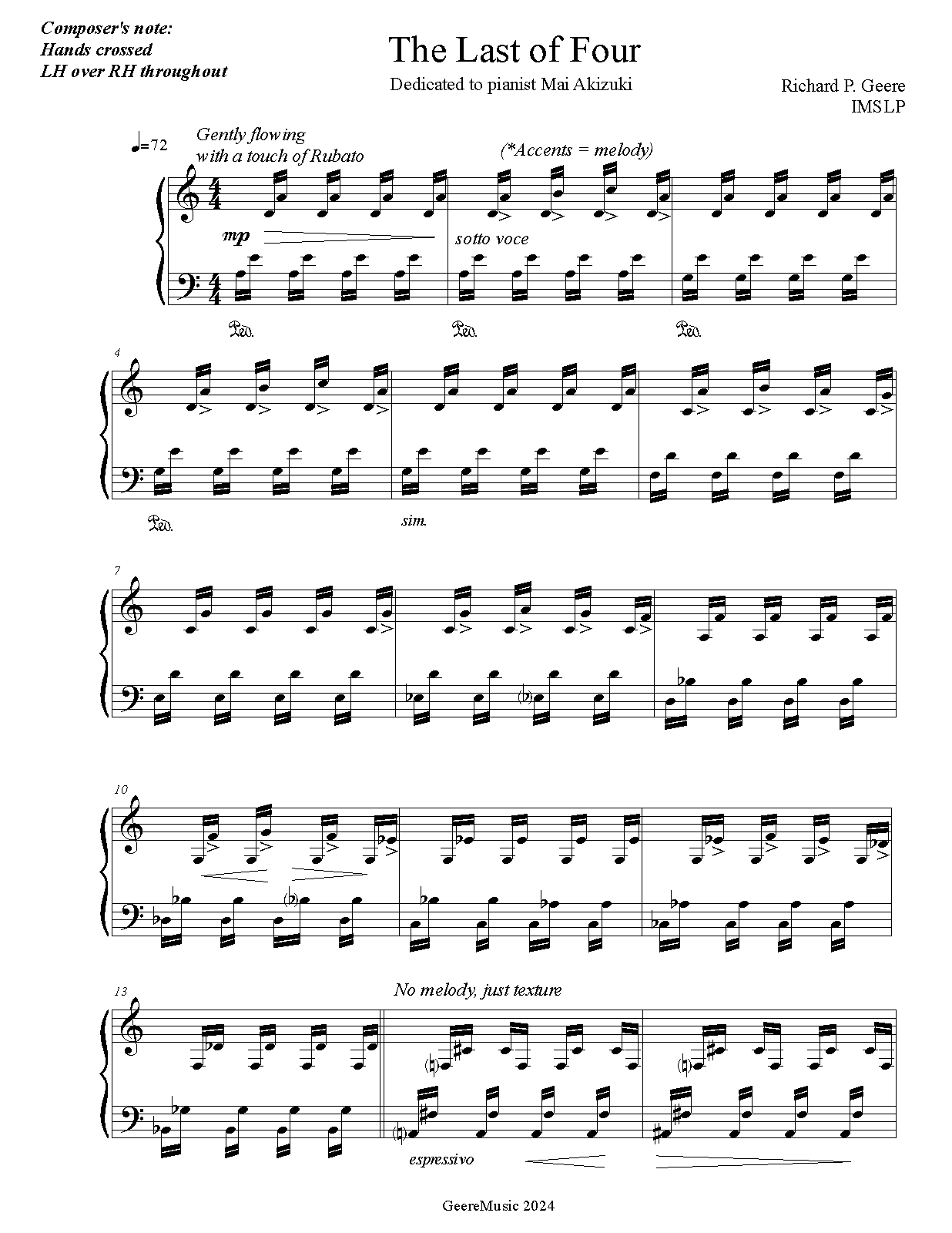 | Extra Information | Hands crossed L over R throughout. Title gives a clue to where the melody is! |