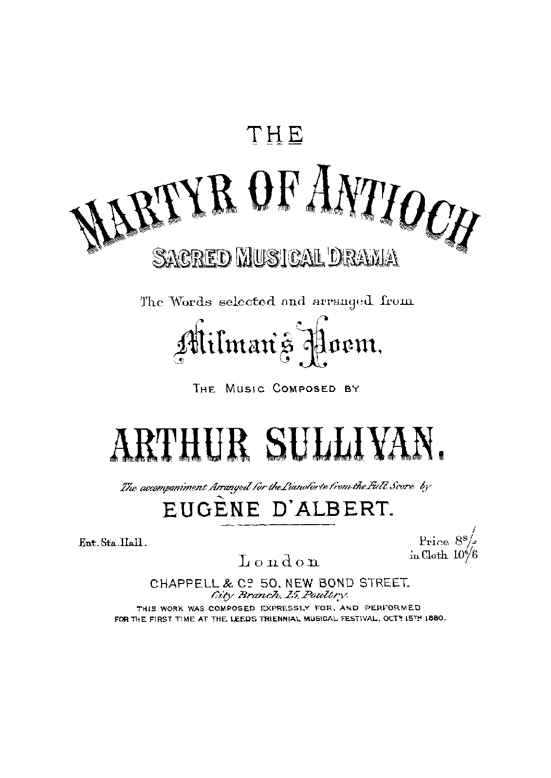 First published in vocal score by Chappell & Co., n.d. [1880]. This first edition contained a choral finale of 31 bars in length. Subsequently, following adverse criticism as to the brevity of this section, a second edition was published with an extended choral finale (47 bars in length): a newly-typeset (2003) version of this second edition vocal score is available from the Gilbert and Sullivan Archive - The Martyr of Antioch