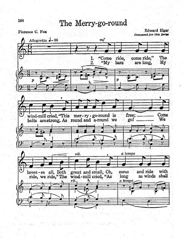 | Extra Information | Unison song for children. Probably Elgar's shortest published song. Florence C. Fox was an American writer of books and poems, and lyricist of songs for children. |