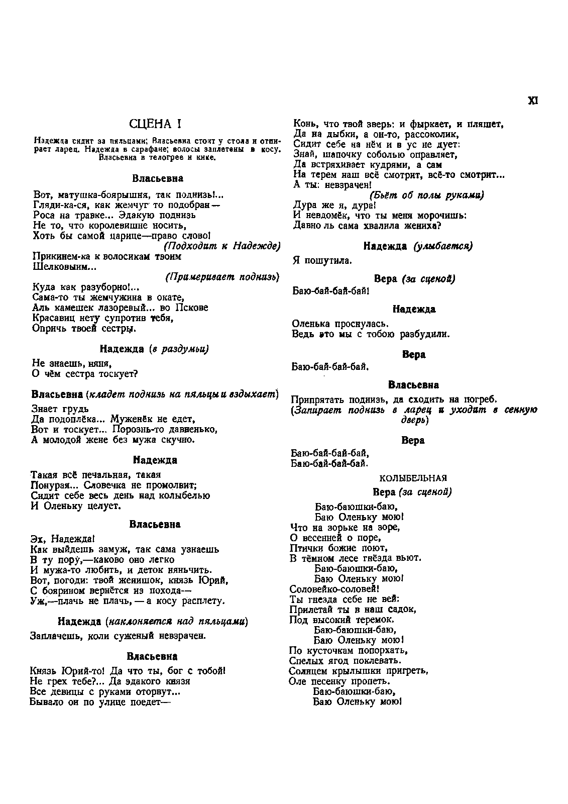 Voices: Boyar Ivan Semyonovich Sheloga (Боярин Иван Семёнович Шелога) (bass) ; Vera Dmitriyevna (Вера Дмитриевна) (soprano) ; Nadezhda Nasonova (Надежда Насонова) (mezzo-soprano) ; Prince Yury Ivanovich Tokmakov (Князь Юрий Иванович Токмаков) (baritone or bass) ; Vlasyevna (Власьевна) (contralto)