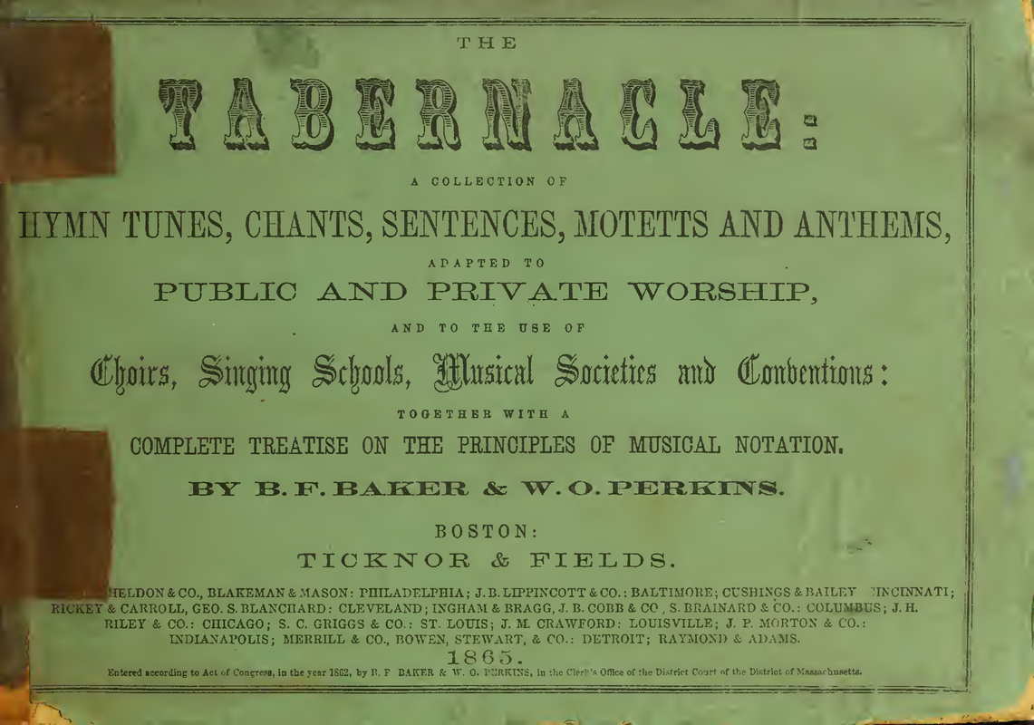 | Alternative. Title | The Tabernacle: a collection of hymn tunes, chants, sentences, motetts and anthems, adapted to public and private worship, and to the use of Choirs, Singing Schools, Musical Societies and Conventions: together with a complete treatise on the principles of musical notation. By B. F. Baker & W. O. Perkins. |