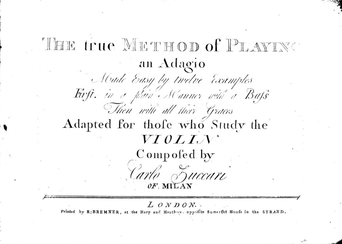 | Work Title | The true Method of Playing an Adagio Made easy by 12 Examples; First, in a plain Manner with a Bass, Then with all their Graces; Adapted to those who Study the Violin |
