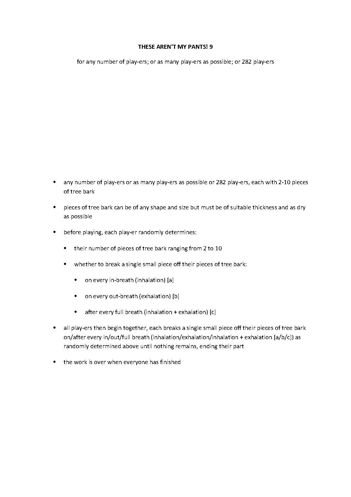 | Instrumentation | any number of play-ers or as many play-ers as possible or 282 play-ers, each with 2-10 pieces of tree bark |