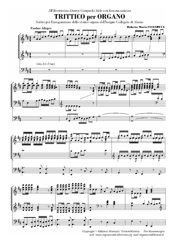 Prima esecuzione il 7 Dicembre 1996 - Trittico per Organo(Fanfare Allegro - Recitativo e Ostinato - Come a Tempo d'inizio) Composto per l'Inaugurazione dello Storico Organo meccanico Romantico Orchestrale della Collegiata insigne di Alassio. Restauro e ampliamento a cura della casa Organaria Francesco e Gustavo Zanin di Codroipo (UD) su progetto fonico del Dott.Giampaolo Mela, Conservatore Onorario dello Storico Organo della Collegiata Insigne di Sant'Ambrogio in Alassio. Restaurato con il contributo del Ministero per i Beni Culturali.