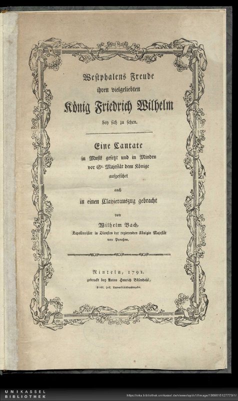 Westphalens Freude ihren vielgeliebten König Friedrich Wilhelm bey sich zu sehen. Eine Cantate in Musik gesetzt und in Minden vor Sr. Majestät dem Könige aufgeführt auch in einen Clavierauszug gebracht von Wilhelm Bach