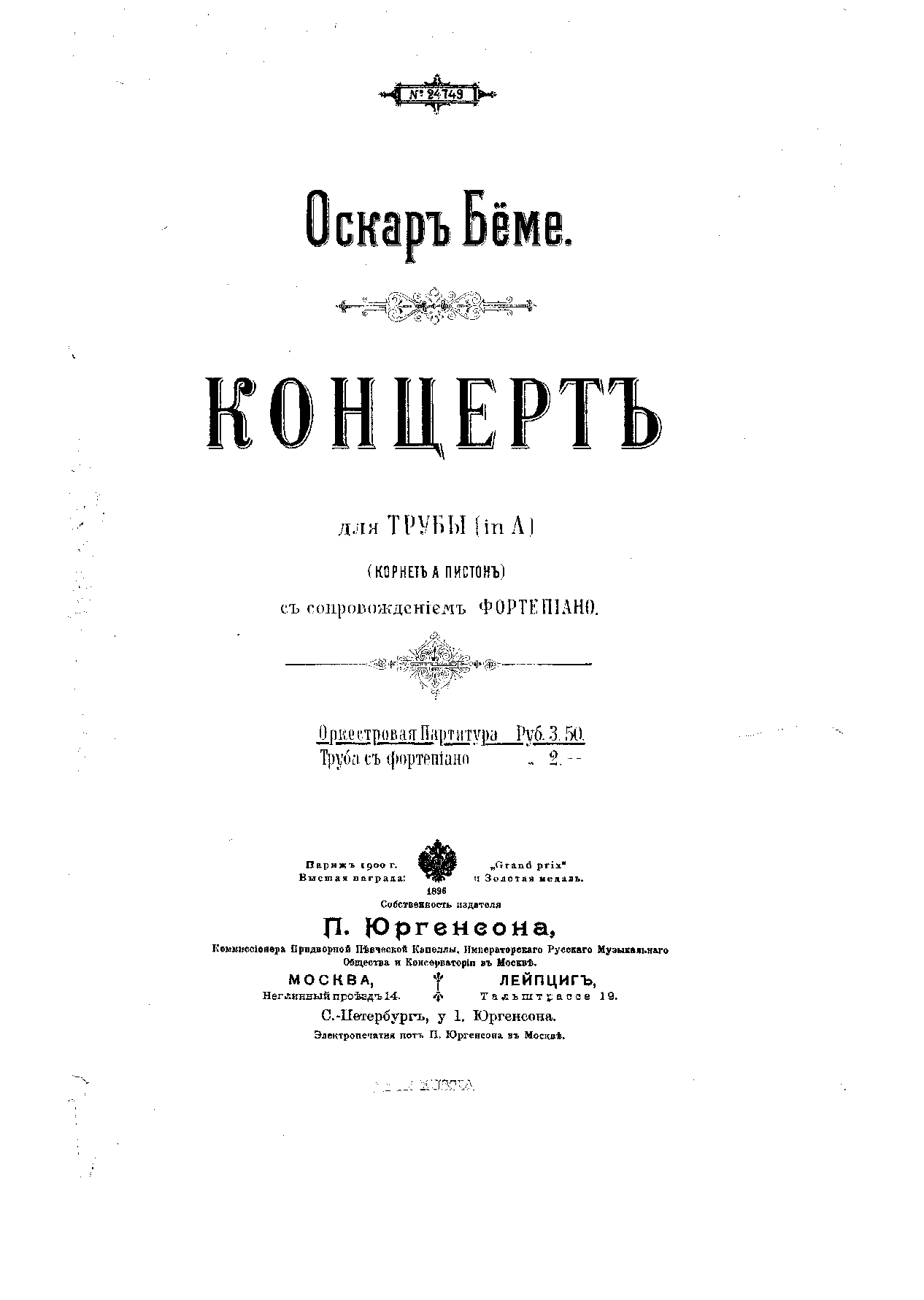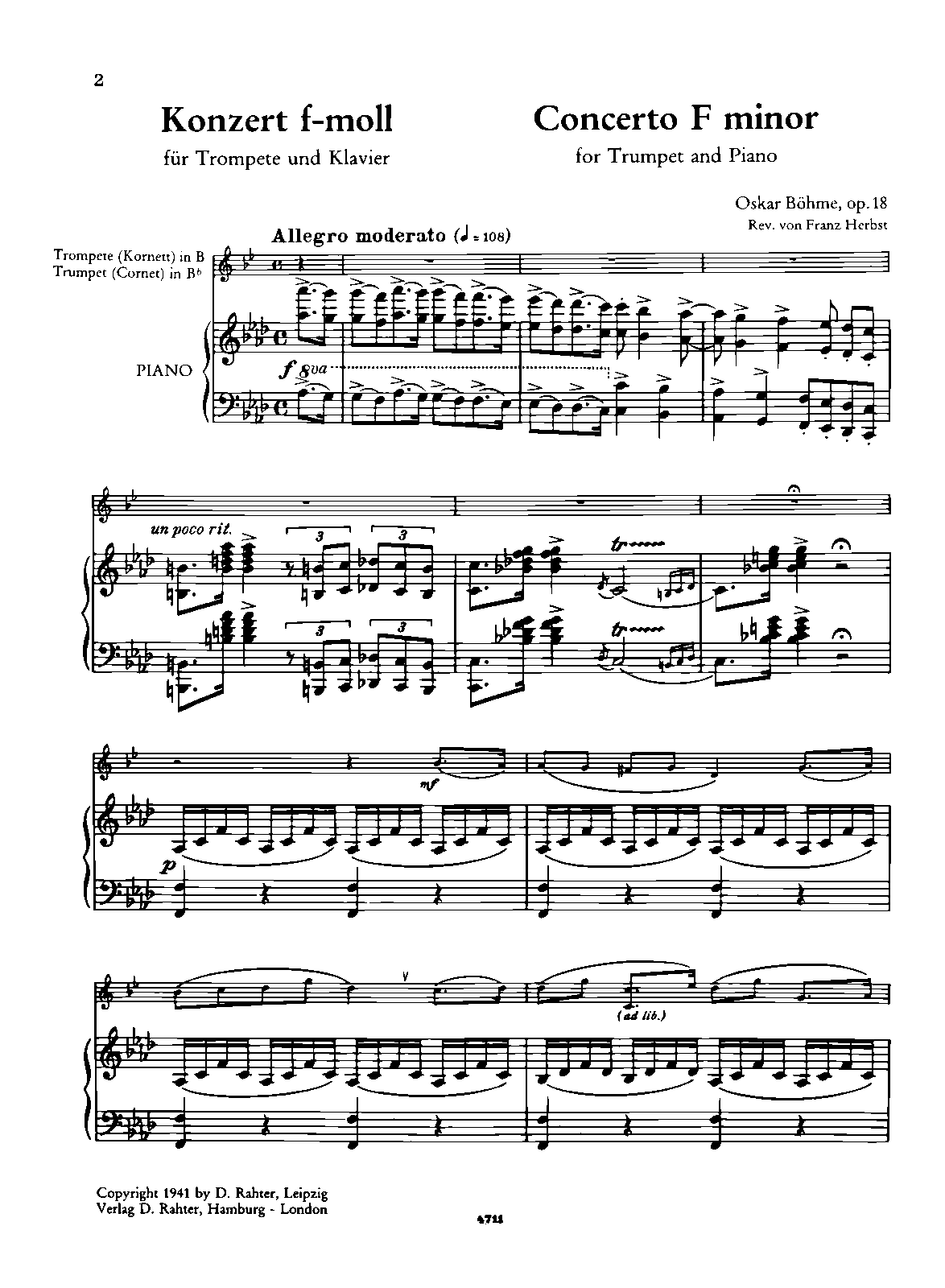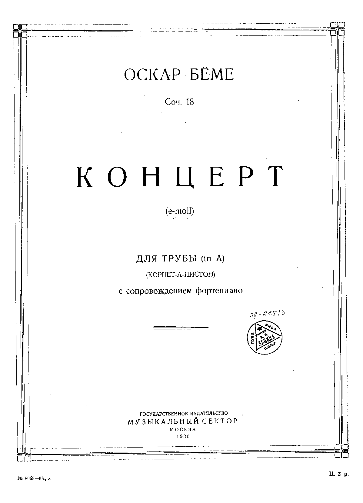 | Extra Information | Until recently, was transposed to F minor when published in the mid-20th century by D. Rahter e.g. (So a 2010 Schmid edition edited by trumpeter Edward Tarr is titled "Konzert e-Moll op. 18 für Trompete (oder Cornet à pistons) in A und Klavier : erste moderne Ausgabe in der Originaltonart".) |
