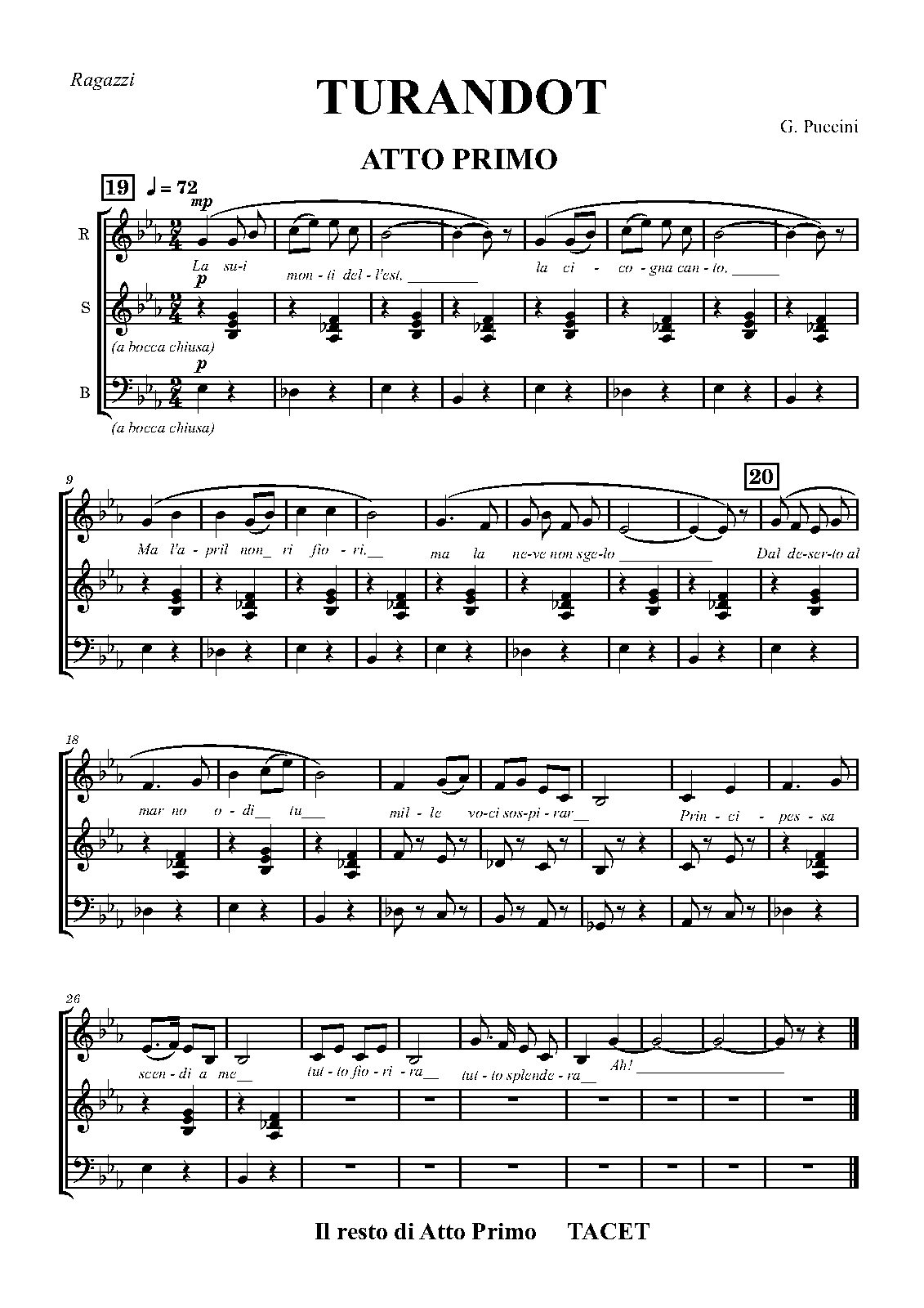 | Extra Information | The opera was mostly complete upon Puccini's death in November 1924, including "Nessun dorma" the famous aria from Act III (whose orchestration is the composer's). Alfano's completion was confined to the last part of Act III (rehearsal 35 to the end). |
