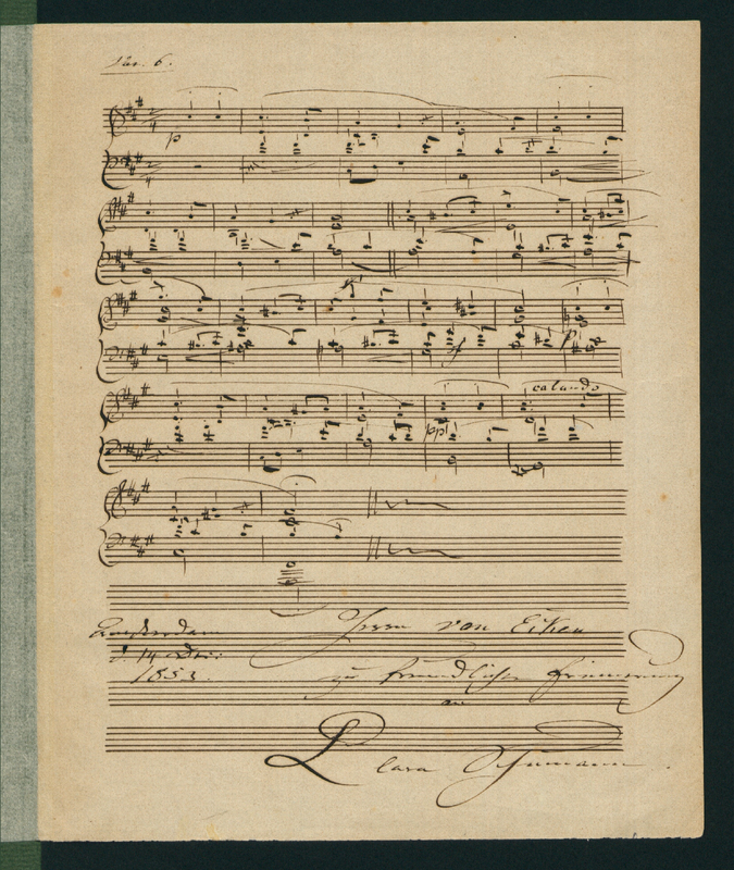 This work is one of the last Clara composed for piano. She presented the piece to Robert Schumann, her husband, for the last birthday he spent with his family. Inspired by this example, Johannes Brahms composed his own Variations on a Theme by Robert Schumann, Op.9 and dedicated them to Clara.