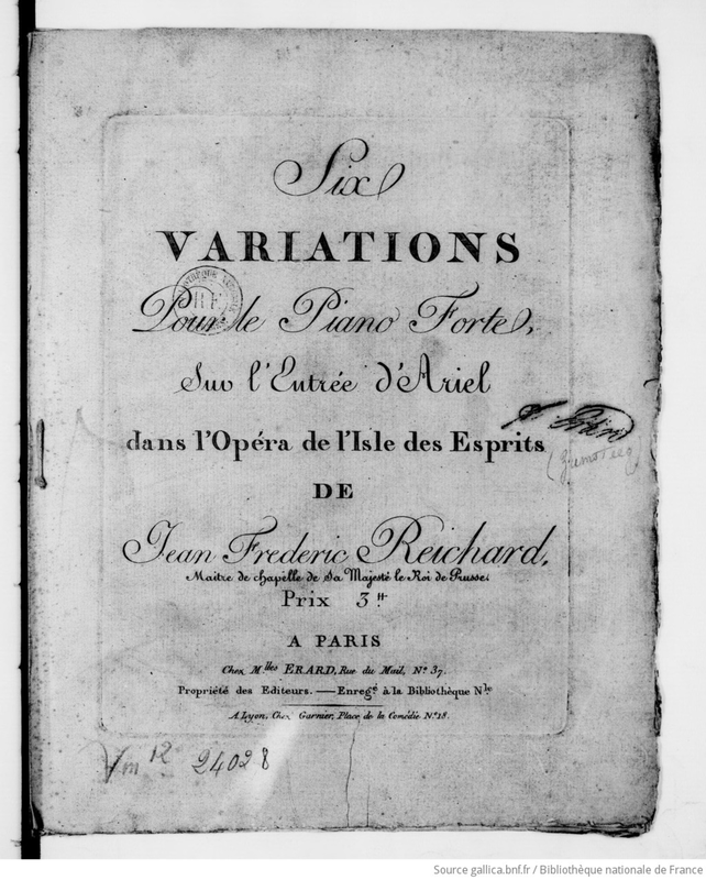 | Alternative. Title | Six [sic] Variations pour le Piano Forte, sur l'Entrée d'Ariel dans l'Opéra de l'Isle des Esprits de Jean Frederic Reichard Variationen über die Musik zur Erscheinung Ariels aus der Oper Die Geister Insel |