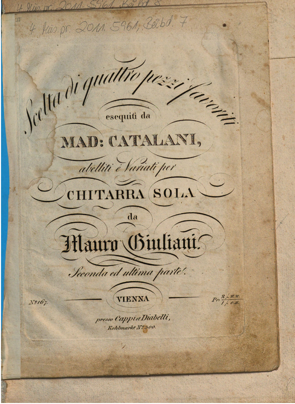 | Alternative. Title | Scelta di quattro pezzi favori esequiti da Mad Catalani abelliti é variati per chitarra sola |