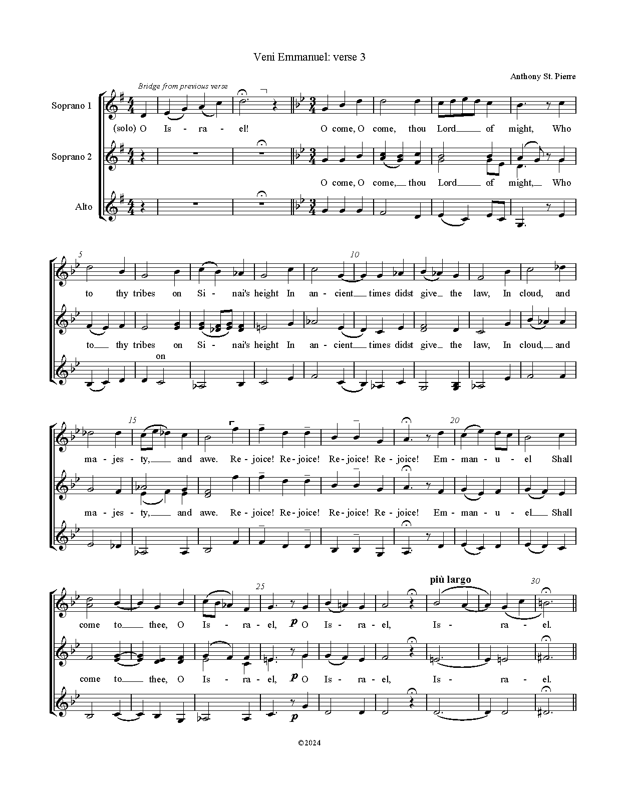 | Extra Information | Three-voice settings of the Advent hymn 'Veni Emmanuel' that may be substituted for verses 3 (SSA) and 5 (TBB). |