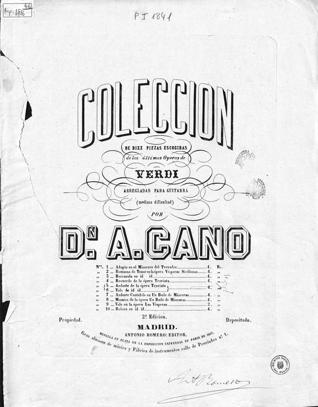 | Alternative. Title | Colección de diez piezas escogidas de las últimas óperas de Verdi arregladas para guitarra (mediana dificultad) |