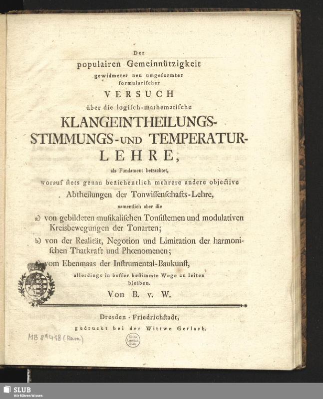 Der populairen Gemeinnützigkeit gewidmeter neu umgeformter formularischer Versuch über die logisch-mathematische Klangeintheilungs- Stimmungs- und Temperatur-Lehre, als Fundament betrachtet, worauf stets genau beziehentlich mehrere andere objective Abtheilungen der Tonwissenschafts-Lehre, namentlich aber die a. von gebildeten musikalischen Tonsistemen und modulativen Kreisbewegungen der Tonarten; b. von der Realität, Negotion und Limitation der harmonischen Thatkraft und Phœnomenen; c. vom Ebenmaas der Instrumental-Baukunst, allerdings in besser bestimmte Wege zu leiten bleiben.