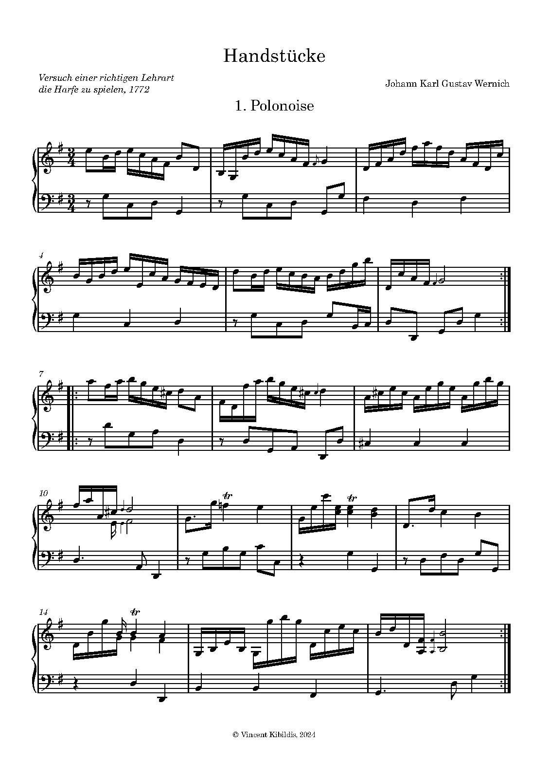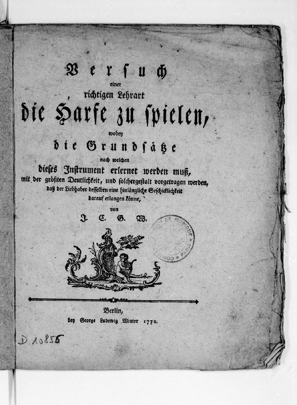 | Alternative. Title | Versuch einer richtigen Lehrart die Harfe zu spielen, wobey die Grundsaetze nach welchen dieses Instrument erlernet werden muss, mit der groessten Deutlichkeit, und solchergestalt vorgetragen werden, dass der Liebhaber desselben eine hinlaengliche Geschicklichkeit darauf erlangen koenne, von J. C. G. W. |