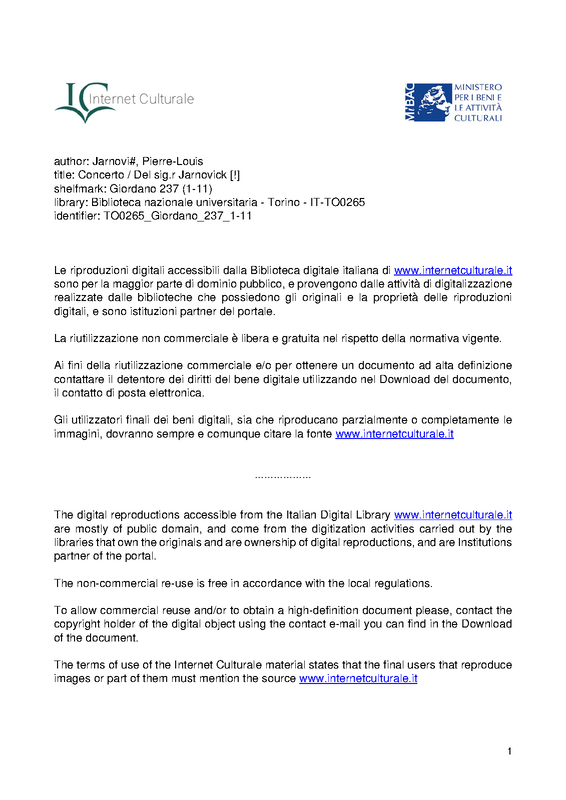 Concerto a Violino Principale, Violino Primo Secondo Alto Basse. Deux Hautbois Deux Cors de Chasse ad Libitum. Composés par Mr Giornovichi, ... Libro 1