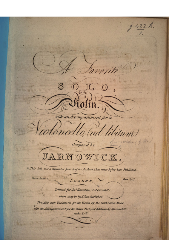 | Alternative. Title | A Favorite Solo, for the Violin, with an Accompaniment for a Violoncello (ad libitum) Composed by Jarnowick. N.B. This Solo was a Particular favorite of the Authors & has never before been Published |