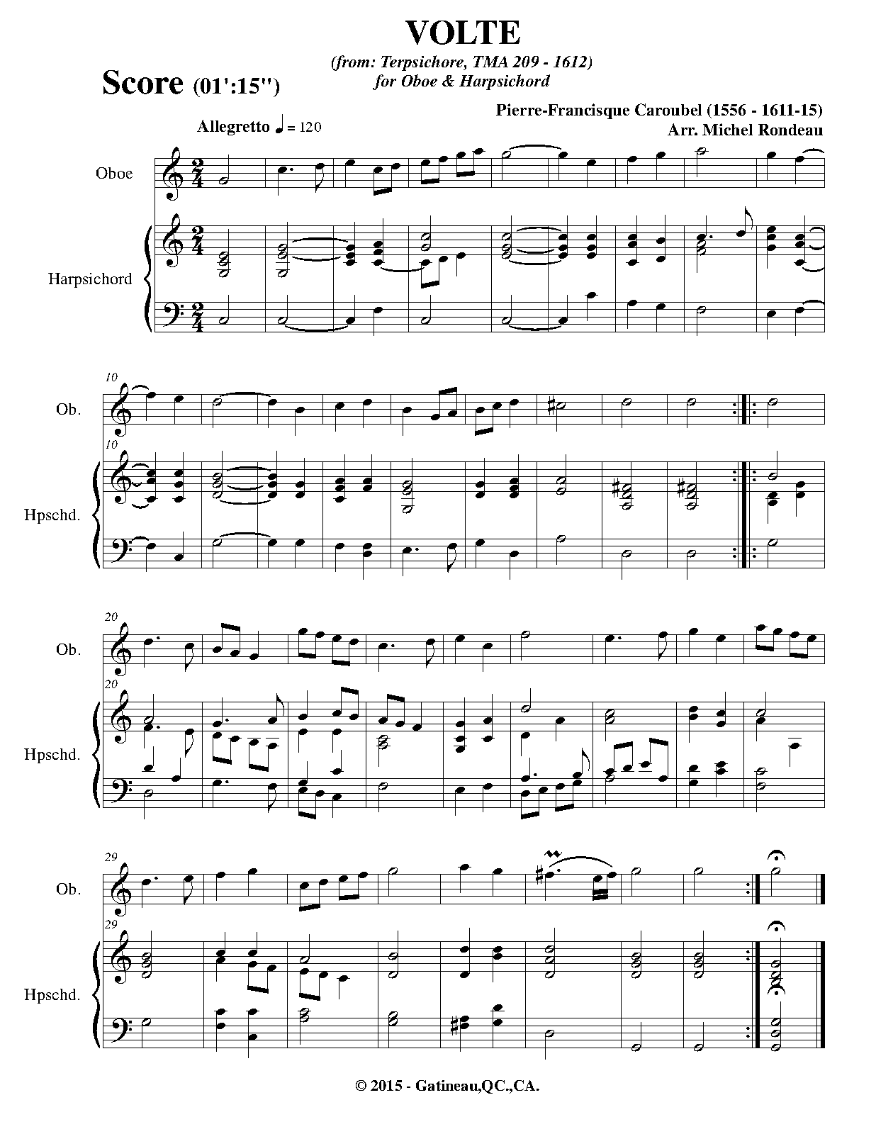 These pieces were assembled and arranged by Praetorius for his 1612 collection. It is unknown how many, or if any, of the works in the collection were actually composed by Caroubel as opposed to being popular dance tunes arranged by him. The instrumentation is not specified in the original, and simply listed as "à 5"