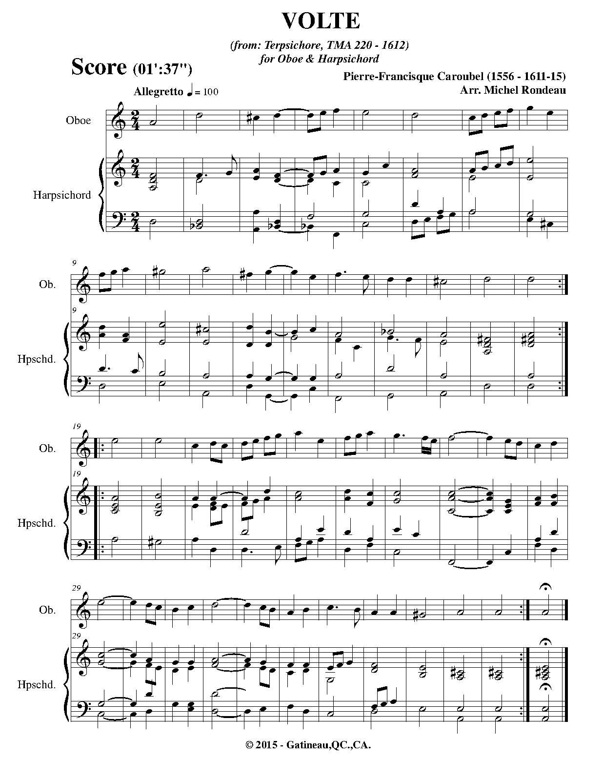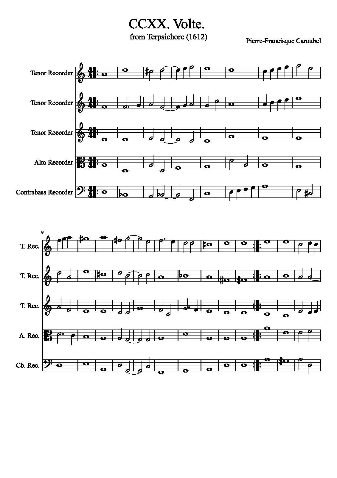 These pieces were assembled and arranged by Praetorius for his 1612 collection. It is unknown how many, or if any, of the works in the collection were actually composed by Caroubel as opposed to being popular dance tunes arranged by him. The instrumentation is not specified in the original, and simply listed as "à 5"