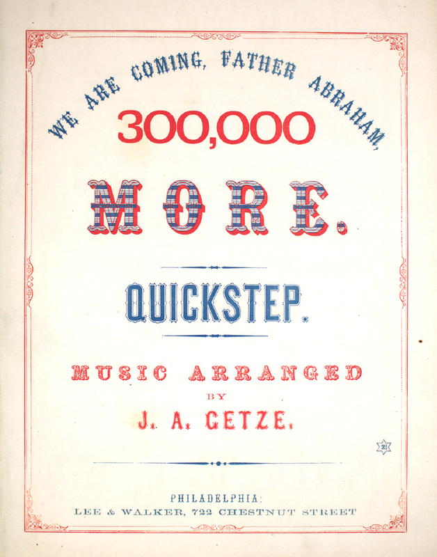 We Are Coming, Father Abra'am was a poem written by James S. Gibbons in response to a call by Abraham Lincoln for volunteers to fight the Civil War. According to Wikipedia, it was set to music by at least 8 composers. In an attempt to trace which one Getze arranged, the following have been compared - Stephen Foster, William Bryant Cullen, Augustus Cull, Ferdinand Mayer, Patrick Sarsfield Gilmore (his is close to this but not exactly the same), I.B. Irving, Charles Grobe, George R. Poulton. In the end, the one that matches this is by "A Volunteer", with the words incorrectly attributed to "Robert Morris", published 1862, Cleveland, Brainard & Co. (available for download at Library of Congress).